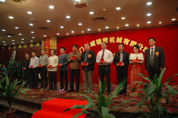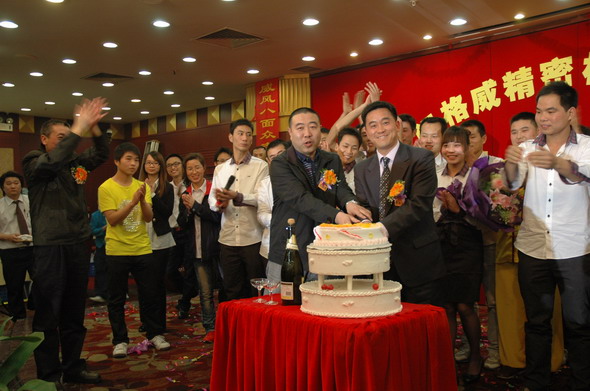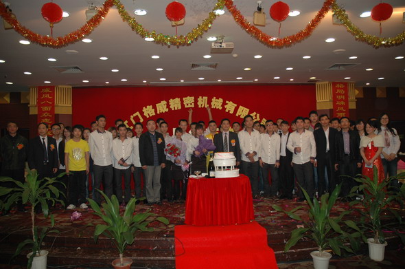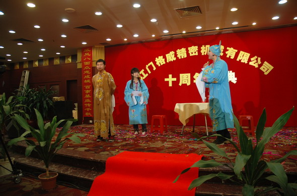 2012年3月25日是江门格威精密机械有限公司成立十周年的大喜之日,为了庆祝十年厂庆,公司组织了一系列丰富多彩的庆典活动,如出公司厂报,出画册,制作公司发展历程的视频,25日晚还组织了隆重的聚餐、娱乐表演暨2011年度优秀员工颁奖和十年老员工颁奖活动。全厂员工欢聚一堂,在大家的欢声笑语中,在高层领导和各位同仁的觥筹交错中,我们的庆典活动在当晚八点钟圆满结束了。